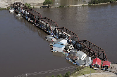 June 2008, the boat houses from Ellis boat harbor and other debris get smashed against the railroad bridge near Timecheck in Cedar Rapids, Iowa.